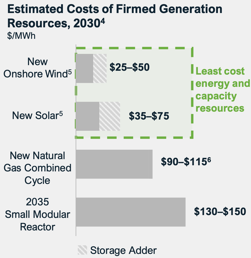 Firm solar electricity—PV plus batteries or gas peakers to guarantee output at times of maximum capacity need—costs ~$100/MWh according to Lazard. That’s on par with gas combined-cycle plants.